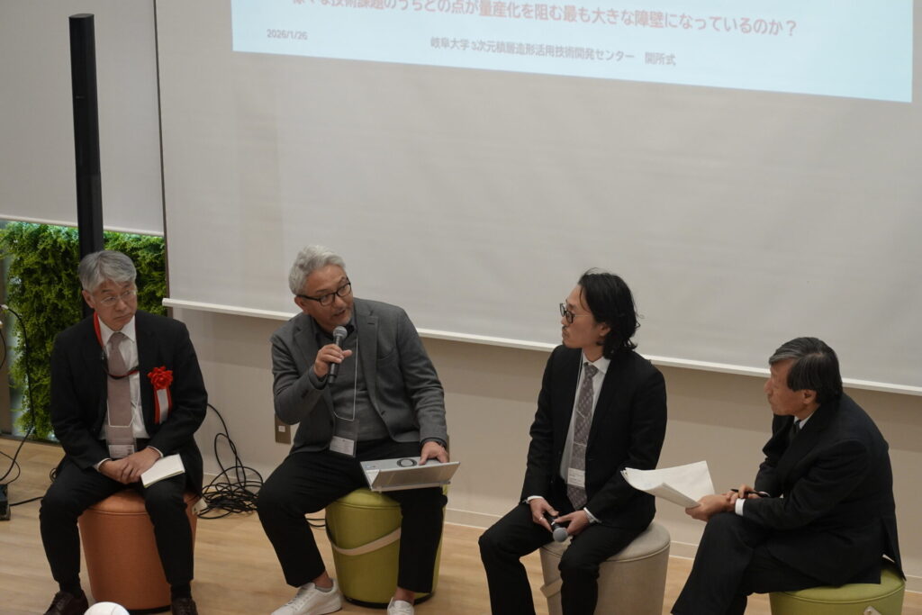 式典では本学学長の挨拶に続き、大今室長から祝辞をいただきました。その後、芦田所長より「積層造形の現状と未来 -3次元積層造形活用技術開発センターへの期待-」と題してご講演いただきました。講演後には参画機関紹介及びパネルディスカッションが行われ、国内製造業の持続的な成長に向け金属積層造形技術が果たす役割について活発な意見交換が交わされました。